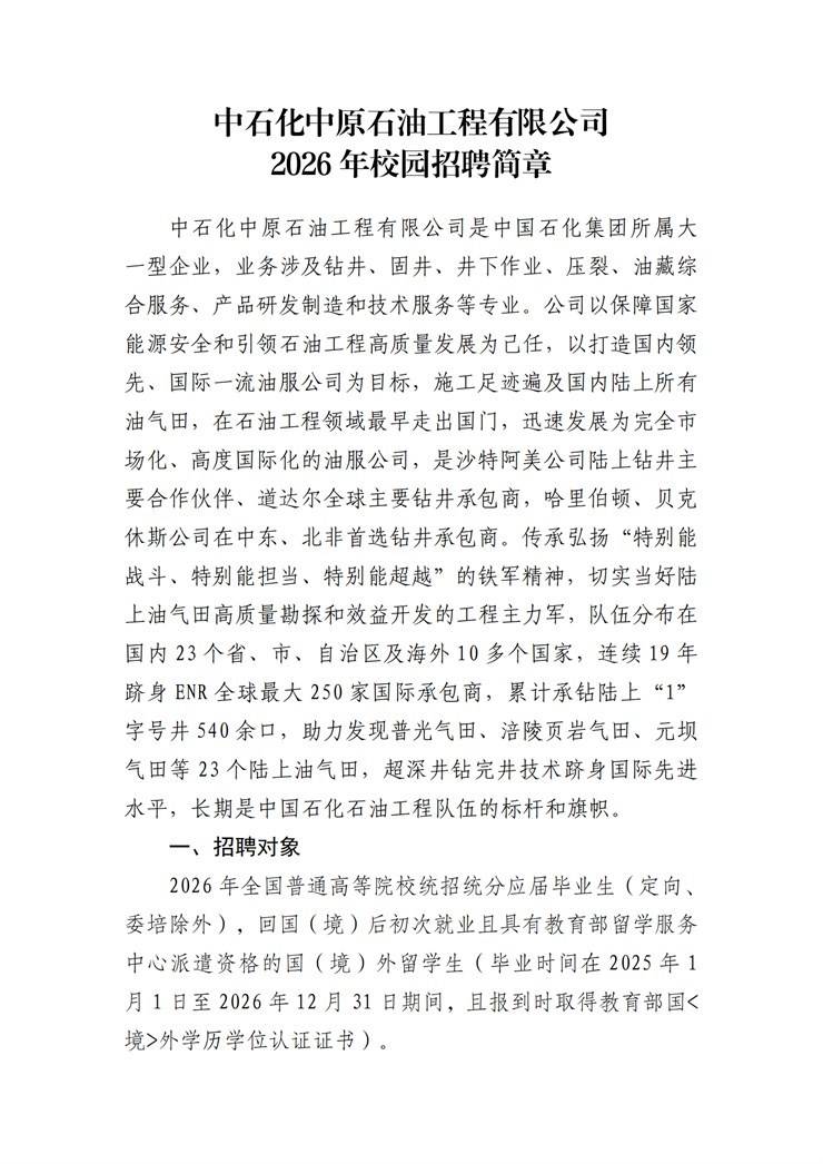 招聘单位:中石化中原石油工程有限公司
